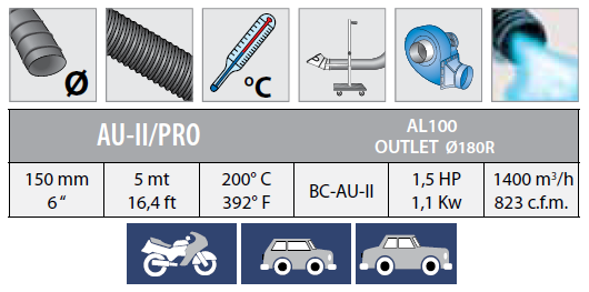 Die AU-Sets sind mit den jeweiligen Erfassungselementen und dazugehörigen Absaugventilatoren gemäß den Auslegungsrichtlinien geeignet zum Absaugen von Abgasen aus Verbrennungsmotoren bei der AU-Prüfung für PKW mit Benzin und Dieselmotoren%2C die ihr Auspuffrohr nach oben oder nach unten ausgeführt haben.