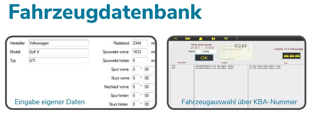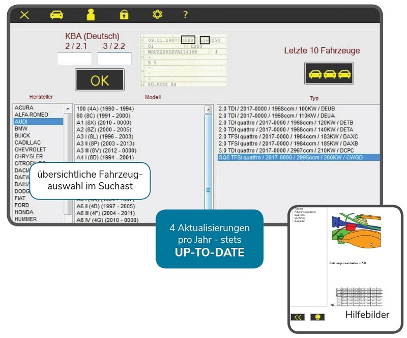 wird kompensiert. Eine Datenbank mit Fahrzeugauswahl nach KBA-Nummer und Einstellbildern